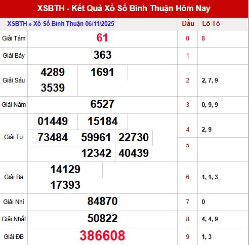 Dựa trên bảng kết quả Xổ số Bình Thuận ngày 06/11/2025, có thể rút ra một số điểm nổi bật sau:
